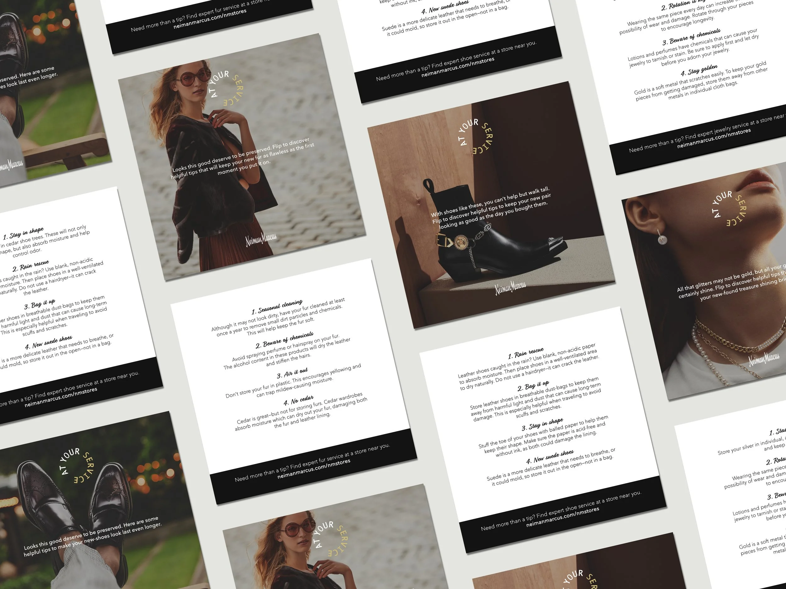 I helped develop and lead the At Your Service campaign for Neiman Marcus, created to remind customers that luxury extends beyond the purchase. Refined emails and printed inserts offered care tips for their most treasured pieces while introducing them to expert services designed to preserve each item’s beauty over time.