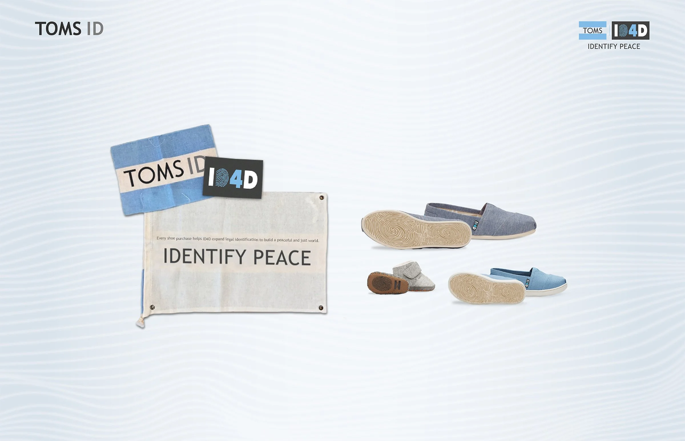 TOMS partnered with ID4D to create TOMS ID, a campaign built on the belief that identity is the first step toward equality. With over 1.5 billion people lacking legal documentation, the initiative aimed to provide digital IDs that would open access to basic human rights, such as education and healthcare. Each pair of TOMS ID shoes featured a fingerprint-patterned sole symbolizing individuality and the power of being seen. Every purchase helped ID4D expand access to identification in underprivileged communities, turning everyday steps into progress toward peace and justice.